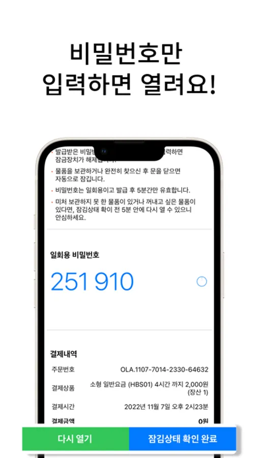 물품보관함, 공유창고 그리고 공유 사물함을 위한 일회용 비밀번호 방식의 라커입니다.