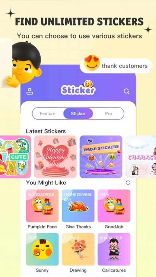 2. We have carefully prepared some sticker packs for each category. A single emoji might be easy to find, but what if I want a whole set? These packs can meet your needs very well. The sticker resources in each pack are related. If You don't want to talk, you can directly use the stickers under this pack.