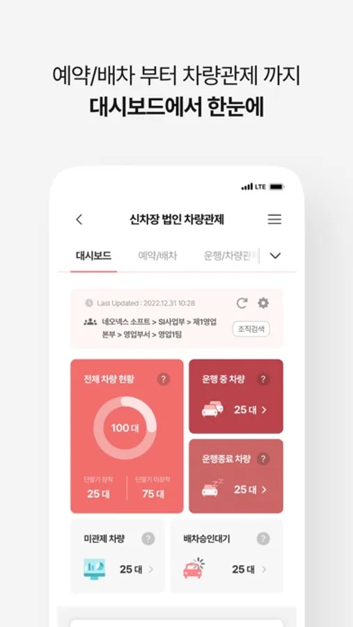 - 신차장 법인차량관제(FMS)를 통해 차량운행일지 작성과 차량 배차 및 제어 기능을 이용할 수 있습니다.