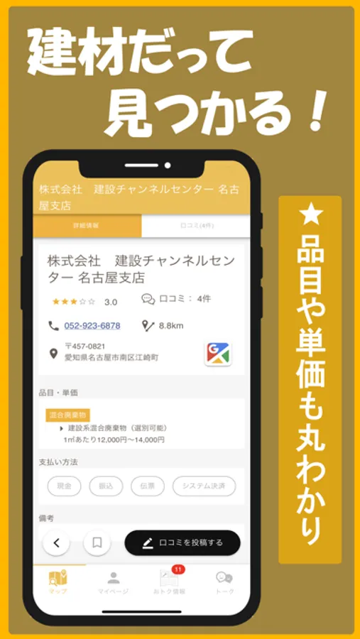 【口コミ機能】 処分場や建材販売業者の口コミを確認できるので、口コミを確認して優良企業かどうかの判断が可能です。またユーザー自ら利用した処分場や販売業者の口コミを投稿することもできます。