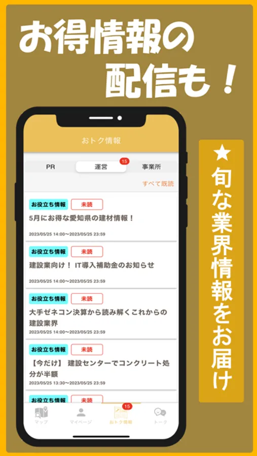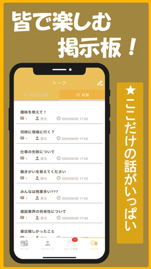 掲示板機能を搭載しているので、建設業向けの話題からお楽しみな話題までさまざま。皆で自由な意見を出したりして楽しもう。見てるだけでも情報入手できますよ。