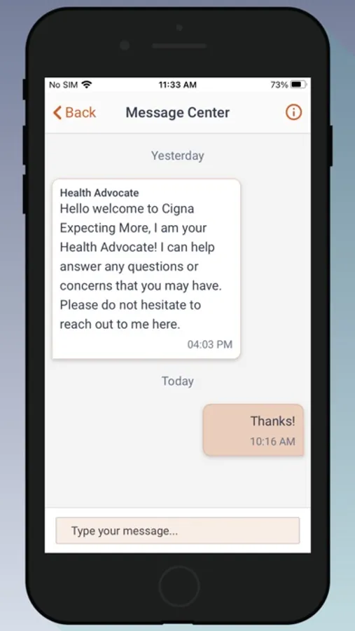 The Cigna Expecting More app offers you an easy way to track and learn about your pregnancy. In this new exclusive app, you’ll have live access within the app’s Message Center to our Health Advocates*. You can ask them anything you would like right there in the app, in real time during business hours. Ask about medical questions or learn about emotional wellness support. They can point you to the right health topic, additional helpful information, and other health resources offered through your medical benefits plan.