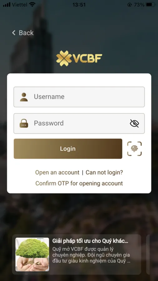 [VCBF Mobile] is an investment management application managed by Vietcombank Fund Management (VCBF). Founded in 2005, Vietcombank Fund Management ("VCBF") is a joint venture between Joint Stock Commercial Bank for Foreign Trade of Vietnam (“Vietcombank”) and Franklin Templeton Investments. Vietcombank is Vietnam’s leading financial institution and Franklin Templeton Investments is an internationally recognized investment firm and a pioneer in emerging market investments.