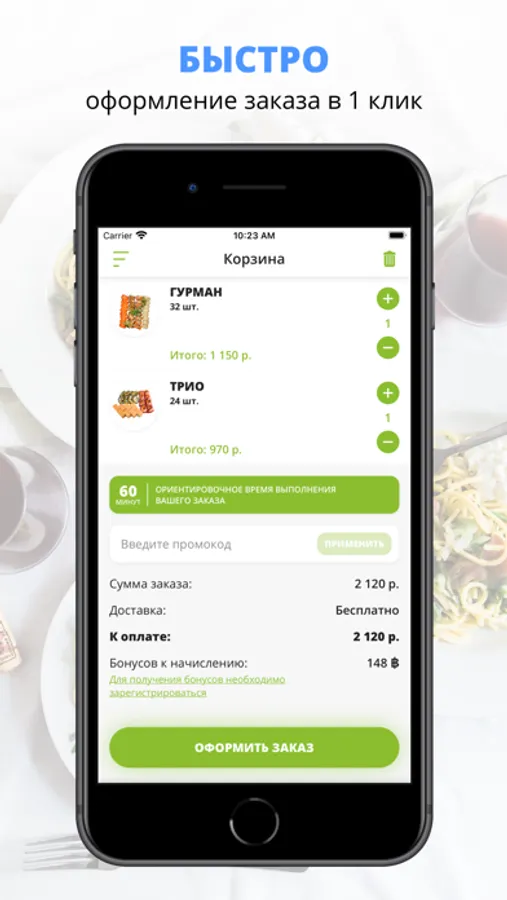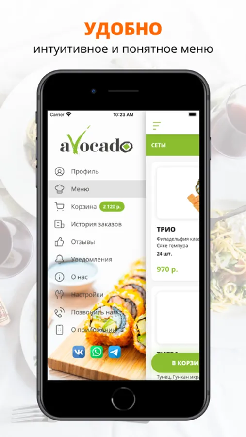 Скачивайте наше приложение, оформляйте заказ и наслаждайтесь любимой едой.