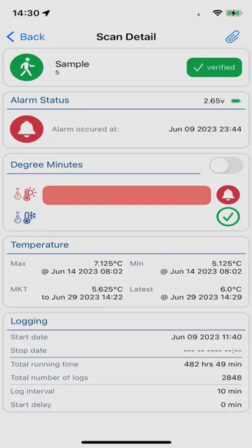 The application captures information from an incrypton device called iToken. The information contains alarm status, scan location and other relevant information such as min, max, or mkt temperature and the entire temperature history.