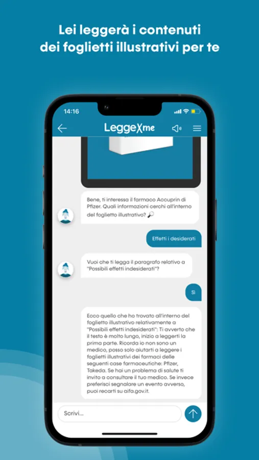 LeggeXme è la app per la lettura dei foglietti illustrativi rivolta ai cittadini e agli operatori sanitari in Italia. LeggeXme consente di parlare con Linda, il chatbot studiato e progettato per guidare gli utenti nella consultazione e ricerca di informazioni contenute nei foglietti illustrativi delle case farmaceutiche che partecipano al progetto, Pfizer e Takeda.