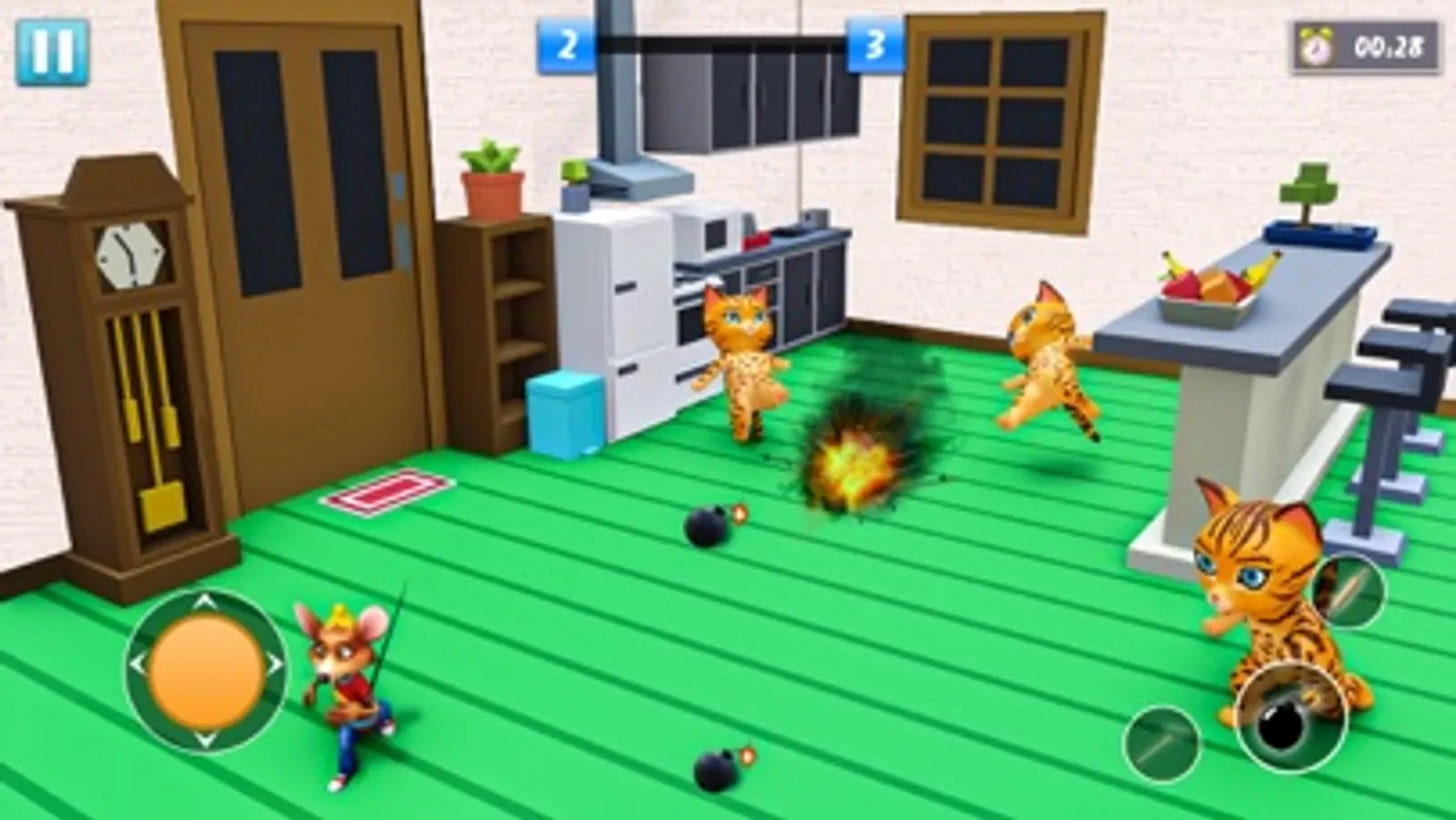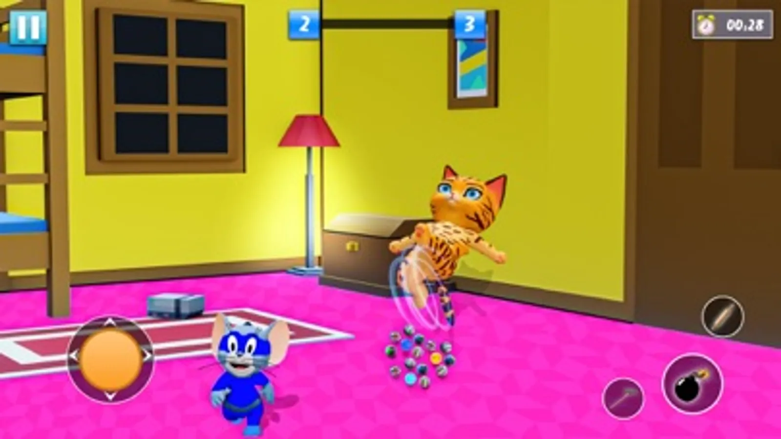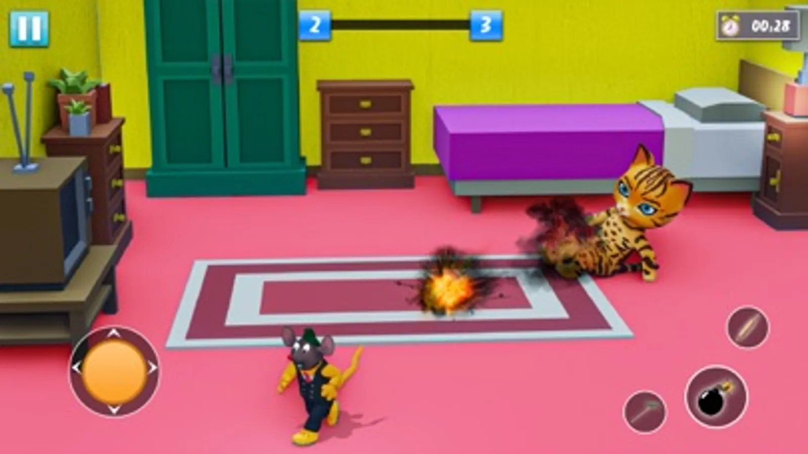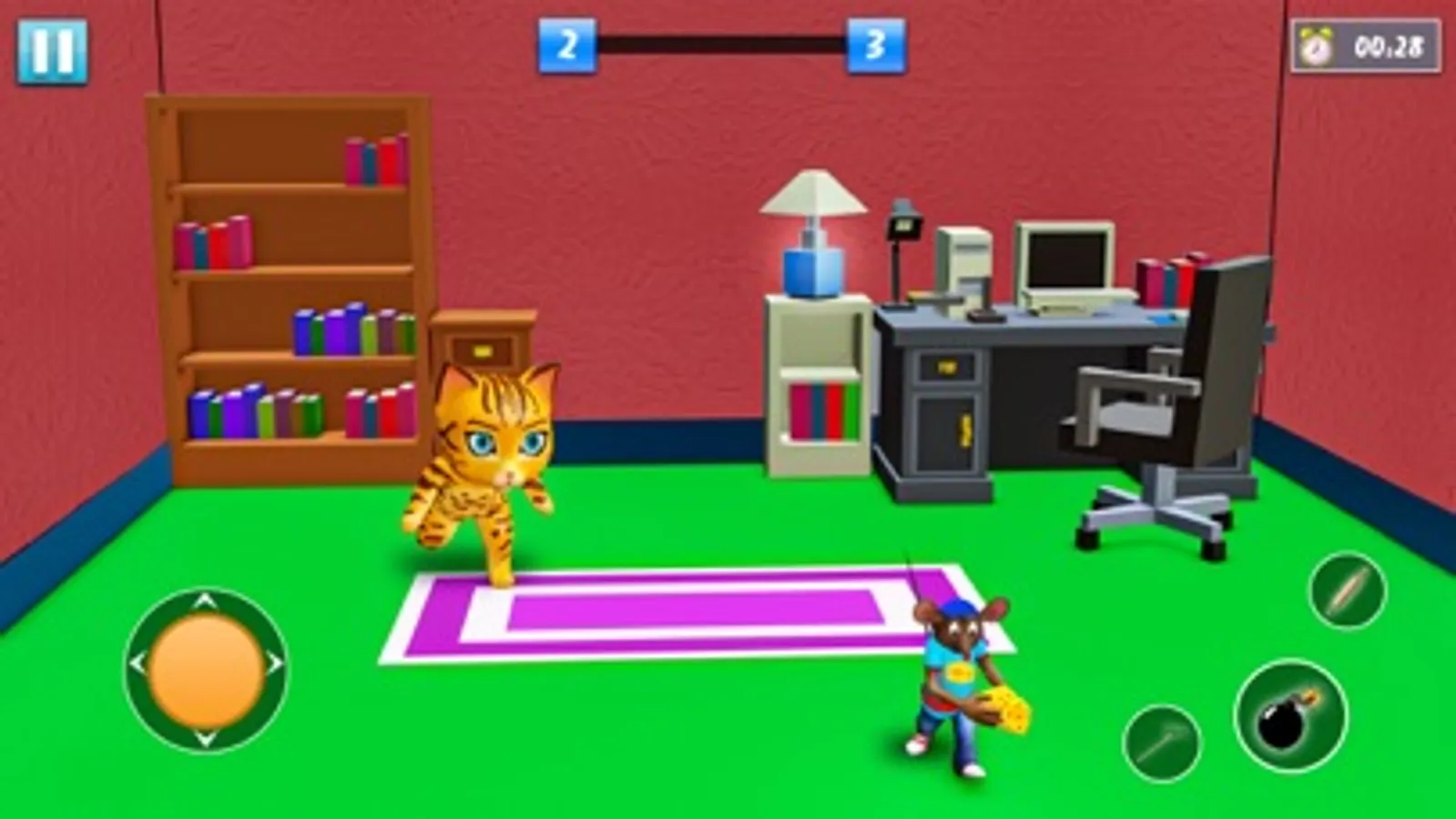 Cat and Mouse chase: cat games is 3rd person isometric free game. Game has two modes. 1. Theft mode and 2. Tease mode. Theft mode has 40 challenging levels while tease mode is endless. Playable characters are 4 with different speed. Also you can purchase Coins from shop. Spend these coins in purchasing different weapons like rolling pin, rakes, bombs and cakes. Enjoy the free game and give your feedback.