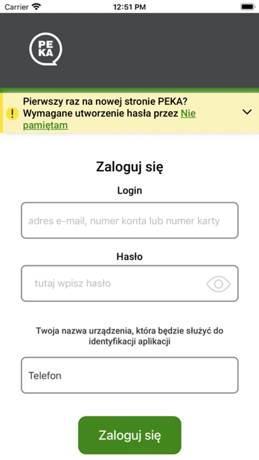 Przy pierwszym uruchomieniu aplikacji należy zalogować się do swojego konta PEKA (jak na www.peka.poznan.pl) i przesłać swoje aktualne zdjęcie. Ze względów bezpieczeństwa, logowanie do konta PEKA poprzez aplikację PEKA możliwe jest tylko na jednym urządzeniu mobilnym, nie częściej niż 1 raz na 24 godziny.