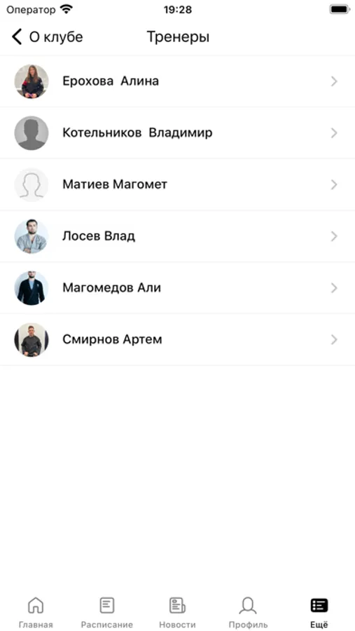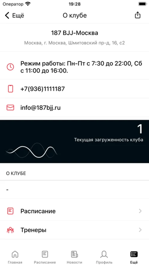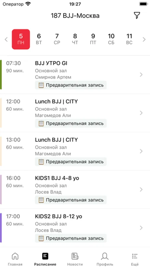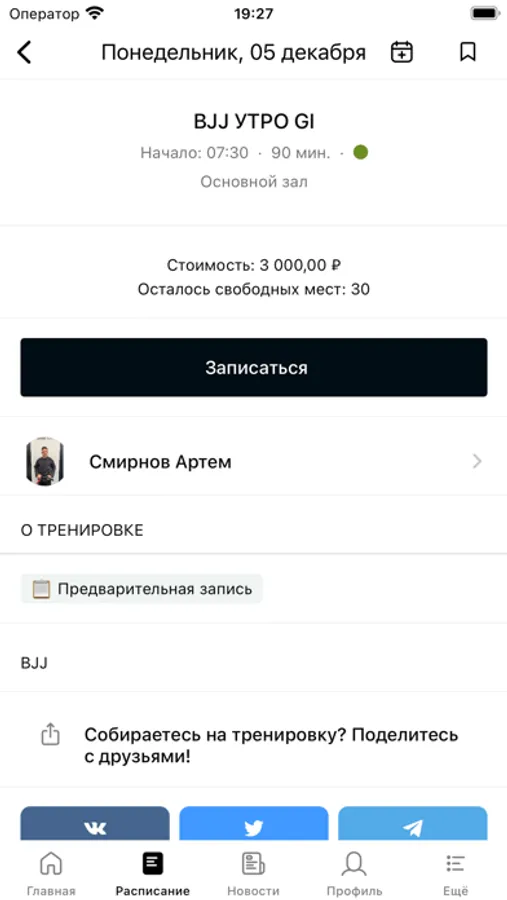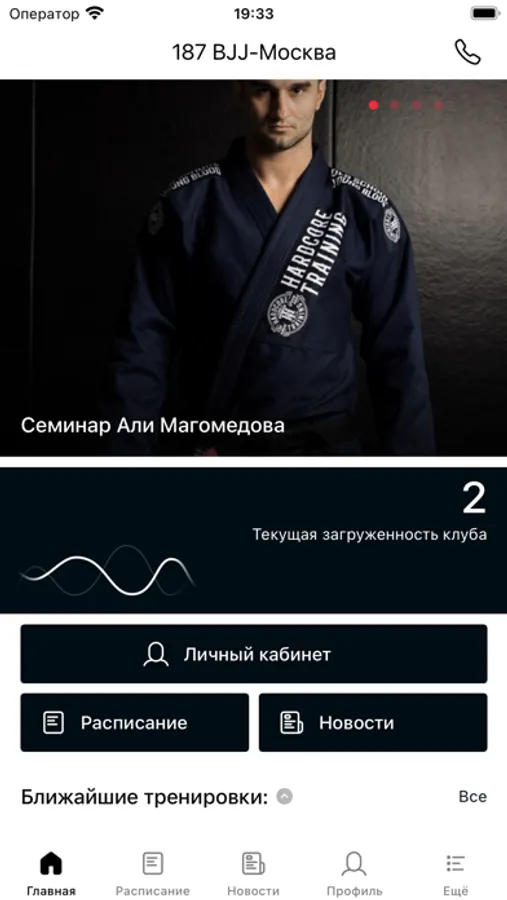 - ознакомится с актуальным расписанием и записаться на тренировку