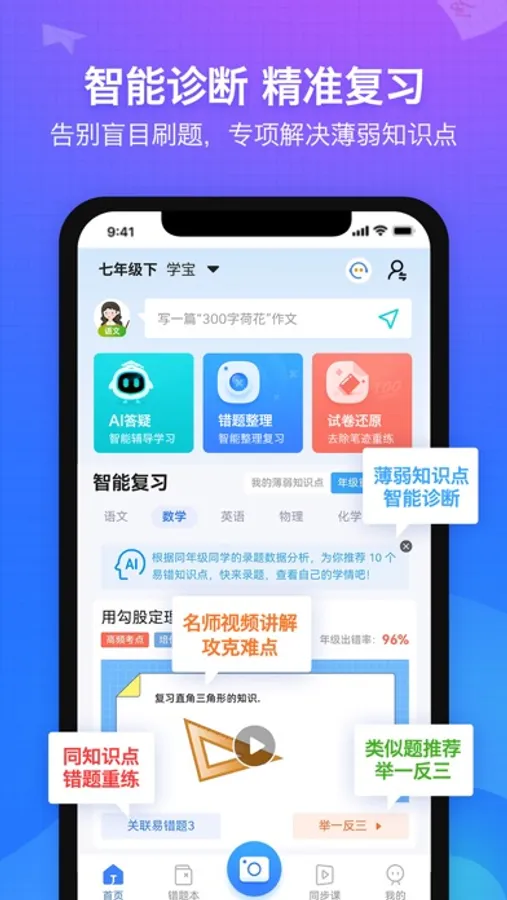 不仅是错题拍照、试卷还原、题库匹配。更是错题智能分析,帮孩子个性化匹配名师讲解、易错题举一反三、真正搞定错题!