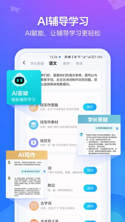 - - AI学长答疑:智能化的解答学科知识、解题思路和学习方法,让学习更高效