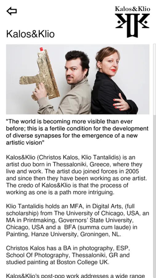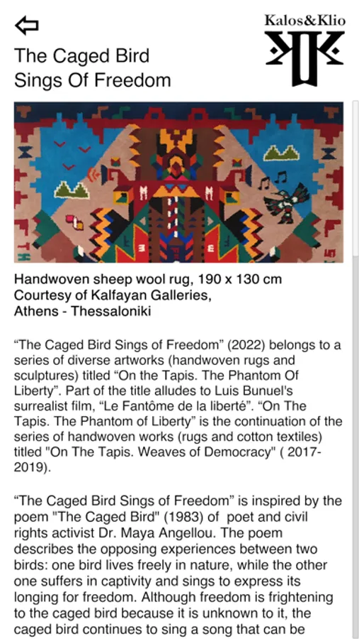 This app uses augmented reality to connect with the traditional hand-woven carpet, "The Caged Bird Sings of Freedom," allowing viewers to experience Kalos&Klio's artwork on a deeper level.