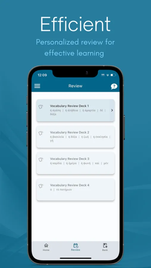 Review Decks: Biblingo uses spaced repetition technology to track which words you're learning, which words you're struggling with, and which words it's time for you to review. Each day, Biblingo auto-generates decks for you to review.