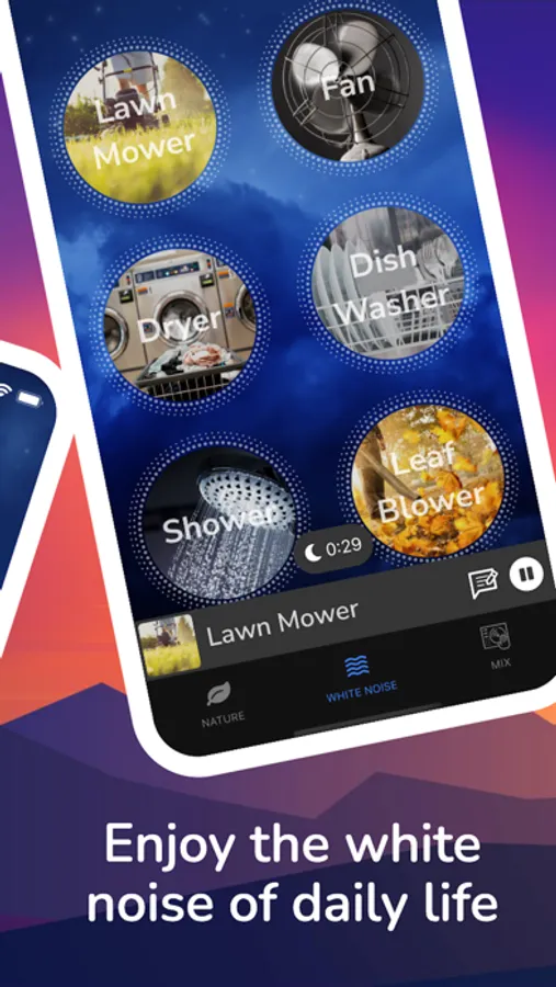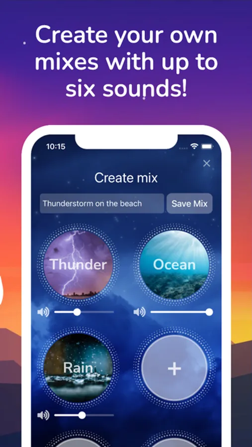 Now you can create mixes! Add up to six sounds to a mix to create your own unique sounds. The volume of each sound in the mix can be adjusted separately, allowing you to customize your mix exactly how you want it. Create unique soundscapes from "Thunderstorm on the Beach" to an "Apartment in the City".