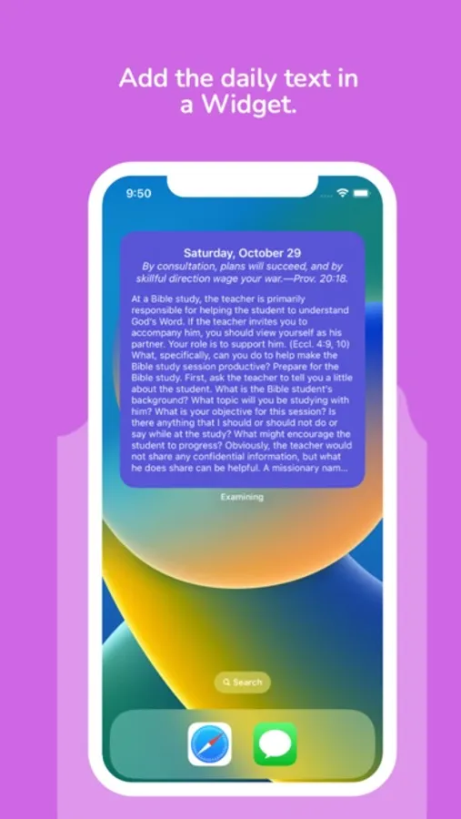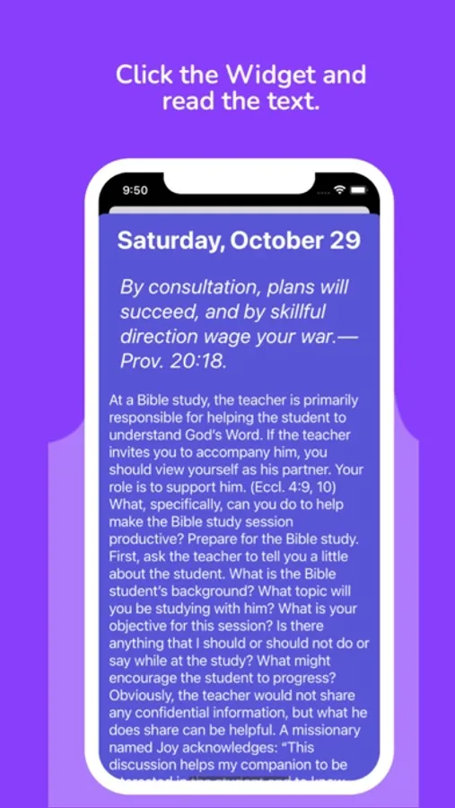 An app to be able to read the text of the day on your main screen through a Widget. You can also read the text on your watch. You can set a notification to alert you every day so you don't forget to read the text. It is also available for iPad.