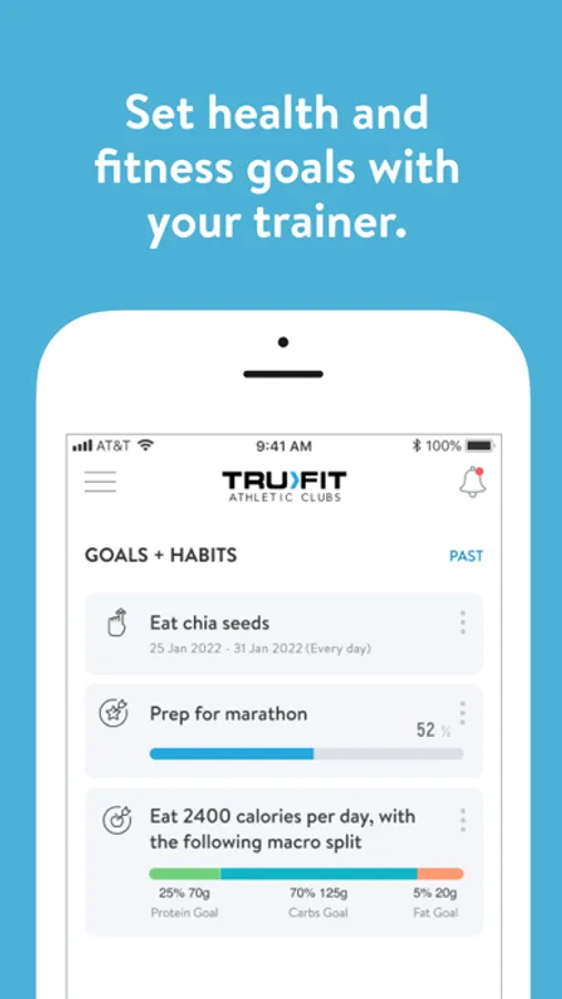 With the TruFit Athletic Club App, you can start tracking your workouts and meals, measuring results, and achieving your fitness goals, all with the help of your personal trainer.