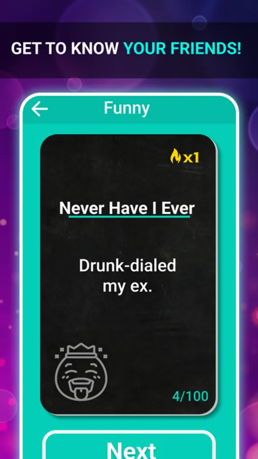 Never Have I Ever is a fun party game. Enjoy and download this great app for free directly on your mobile to play before going out to party and experience an epic night!