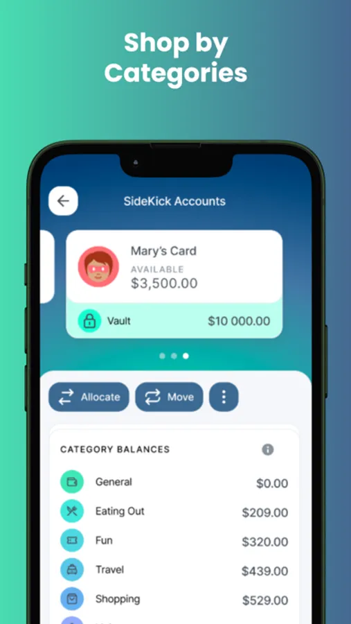 Use the Hero Budget Tool to divide money between our pre-created categories: general, living expenses, eating out, travel, shopping, and fun. Each category was well thought out to help you budget for what is important for your kids. You can control how much is on the card and allocate the funds to each category. As parents, you have the superpower of moving money between categories or adding money to only a specific one. You are in control!
