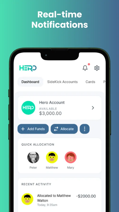 See where the money’s going with real-time spending updates on the Hero app. Need to top-up your kid’s card? Simply log in to your Hero app, load your account and transfer money to their SideKick Mastercard. It’s lightning fast just like a hero!