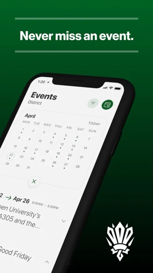 The event section shows a list of events throughout the district. Users can add an event to their calendar to share the event with friends and family with one tap.