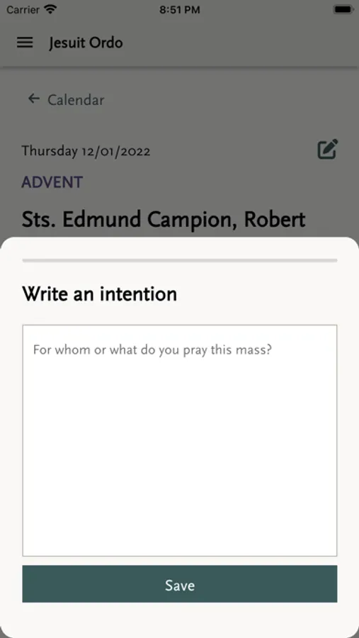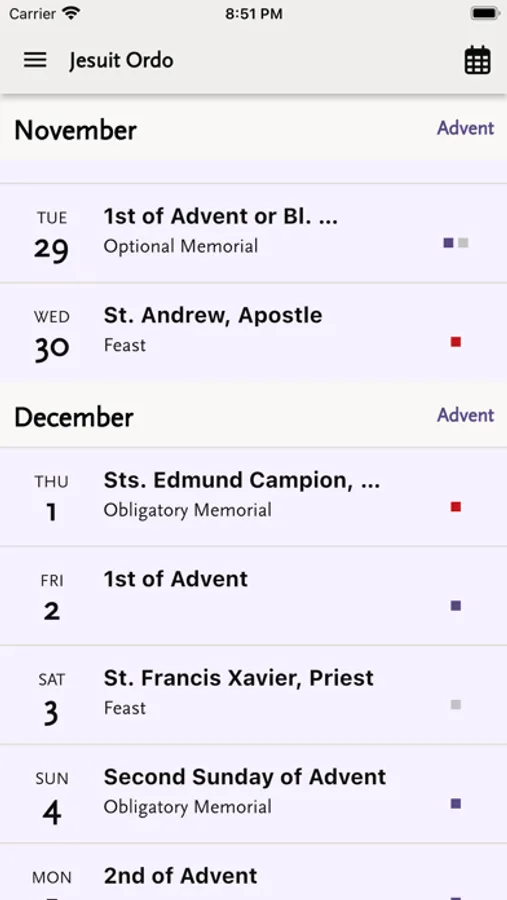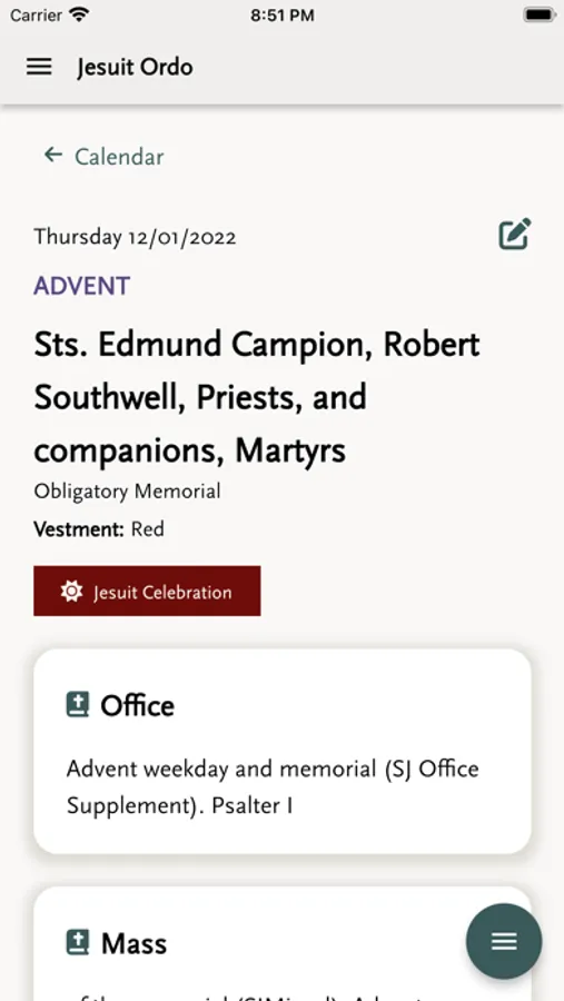The Jesuit Ordo contains the Order of Celebration for the Eucharist and the Liturgy of the Hours for Jesuits in the United States. The Jesuit Ordo reflects the updated calendar of Jesuit saints and blessed issued by the Roman Curia of the Society of Jesus. It follows the liturgical calendar, containing the readings of the day, starting from advent to the end of the following advent.