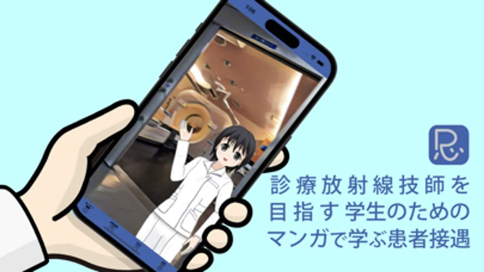 そこで、このアプリケーション役割は、実際に検査の開始から終了までの診療放射線技師の行動を、マンガを通して疑似体験しながら患者さんとのコミュニケーション能力を高めていくための教育用アプリです。