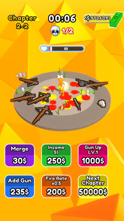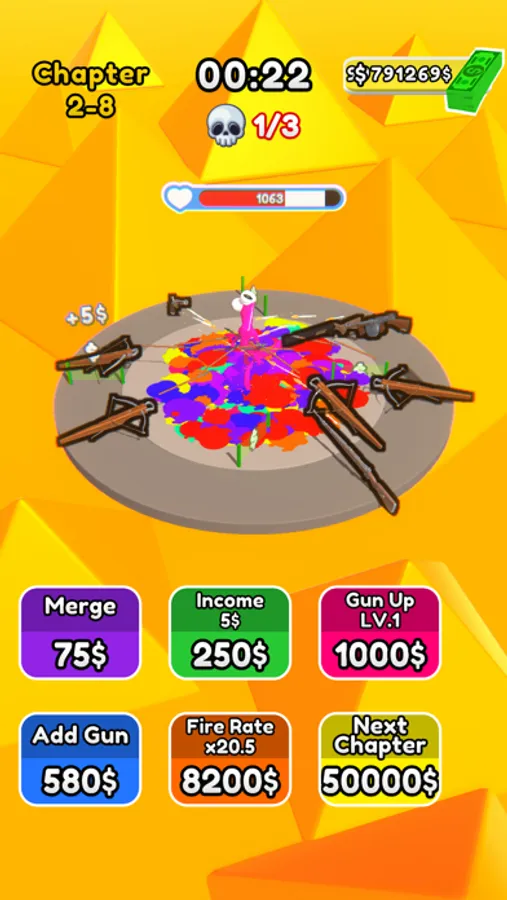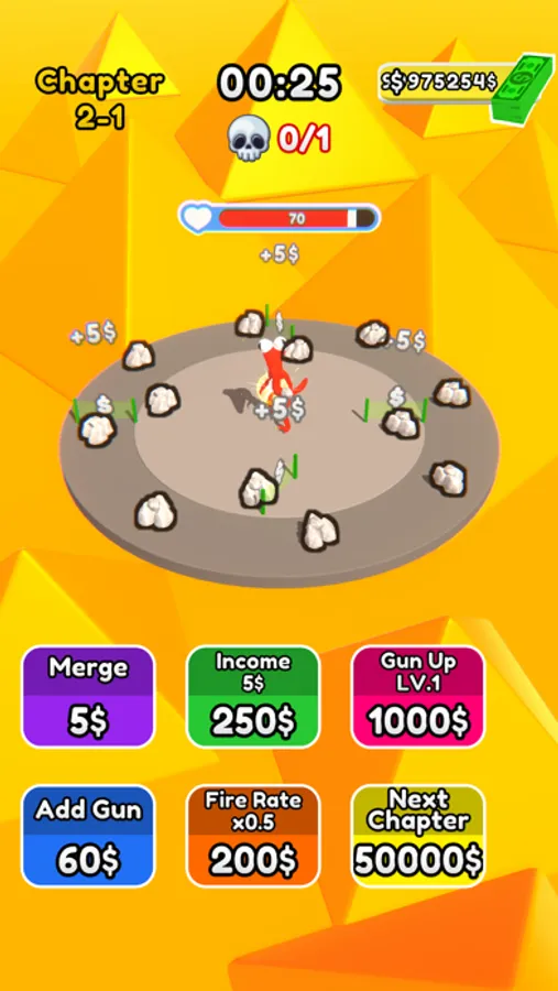 Buy , upgrade and merge guns to eliminate giants monsters. try different circling guns that can be merged infinitely , you can even merge a mass destruction war machines and aircrafts to aid you on your mission