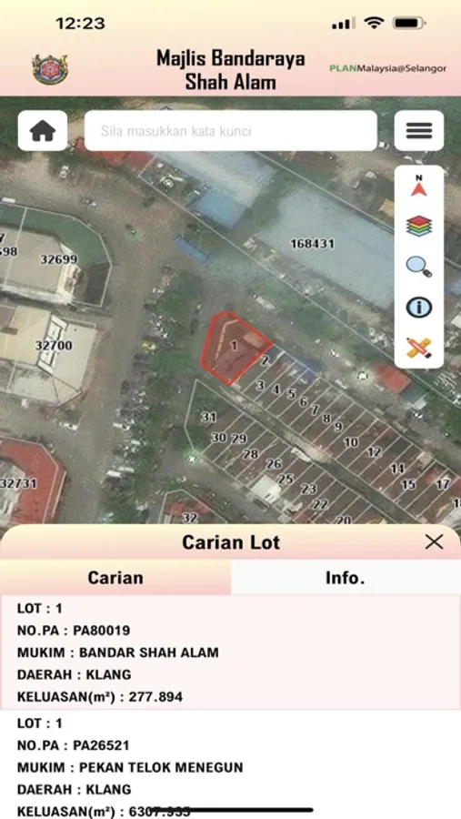 3. Carian maklumat melalui carian Daerah, Mukim dan Pihak Berkuasa Tempatan dalam Negeri Selangor