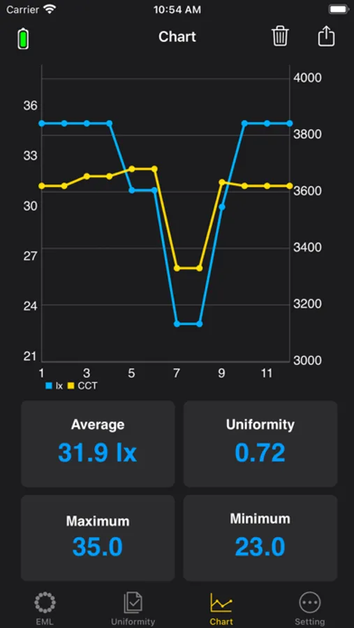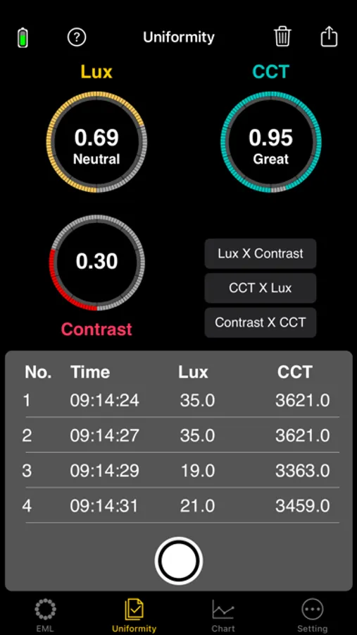 The measurement includes 5 key indexes: illuminance(Lux), correlated color temperature(CCT), contrast, uniformity and Equivalent Melanopic Lux (EML).
