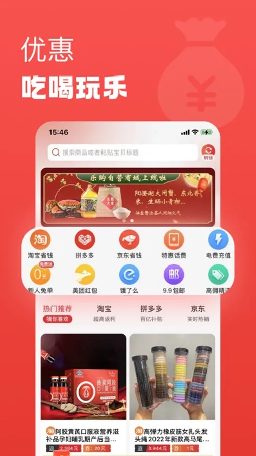 乐购集成了淘宝、天猫、京东、拼多多、美团、饿了么、生活缴费等主流消费省钱购物平台,满足用户日常吃喝玩乐、衣食住行的聚合类APP平台。