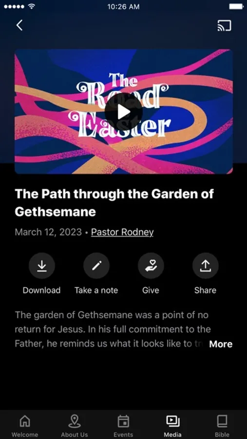 This app will help you stay connected with the day-to-day life of our church. With this app you can: watch or listen to past messages; stay up to date with push notifications; share your favorite messages with friends and download messages for offline listening.