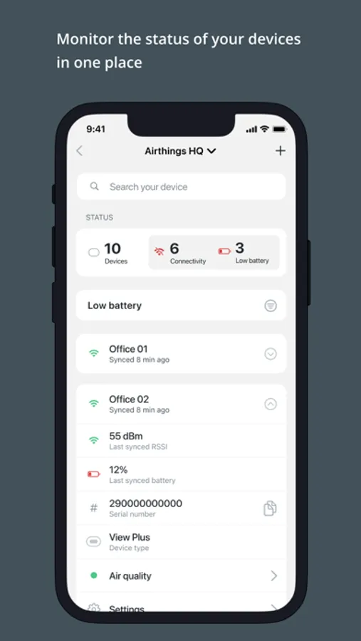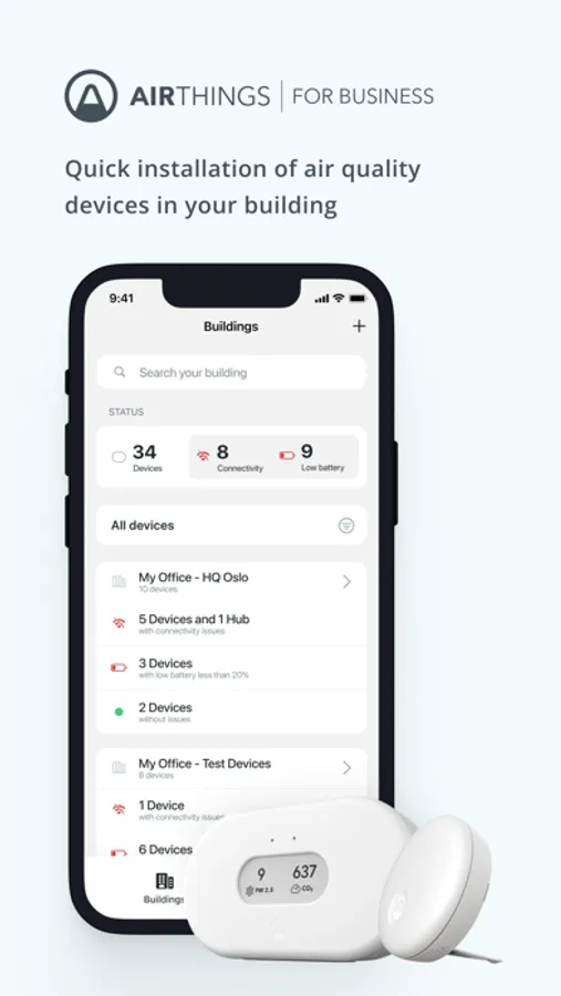 The Airthings Business app is for professional users of the Airthings for Business indoor air quality monitoring solution. It simplifies the installation and management of large-scale deployments of Space devices in offices, schools and public buildings.