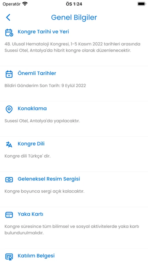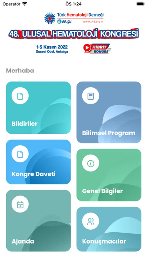 48. Ulusal Hematoloji Kongresi Resmi iOS Uygulaması ile kongre öncesinde, sırasında ve sonrasında yayınlanan içeriklere, genel bilgilere, bilimsel program, konuşmacı bilgilerine ve detaylarına ulaşabilir, sunum ve bildiri bölümlerinden bildirilerin kısa detaylarını inceleyebilir izin verilen sunumları pdf olarak görebilirsiniz. Anlık bildirimler, duyurular ve favori bölümü ile oturumlardan, öğle ikramları gibi sosyal etkinliklerden haberdar olabilirsiniz.
