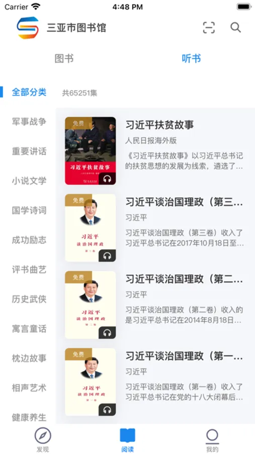 “悦读三亚”数字农家书屋客户端,采用移动互联网、人工智能、大数据技术打造的"万村数字化农家书屋”平台的配套服务客户端,配备电子图书7万册、有声读物3万集。可依托平台开展“百姓点单”选书、荐书活动。
