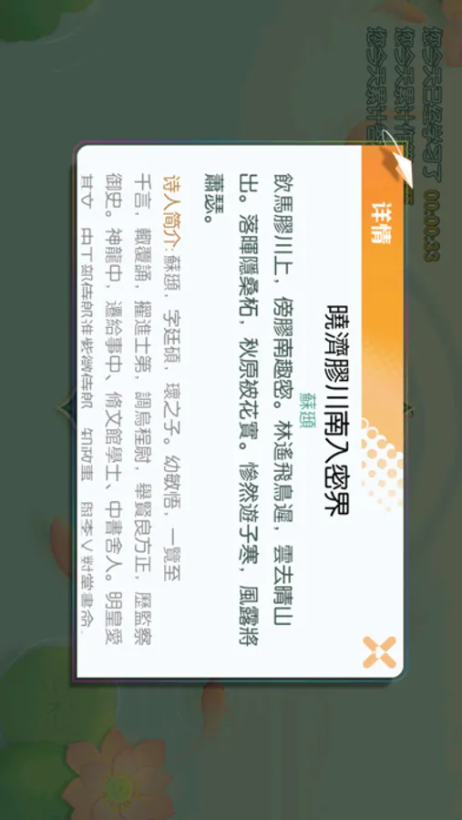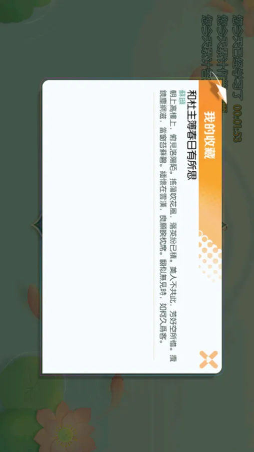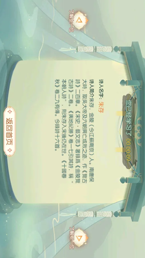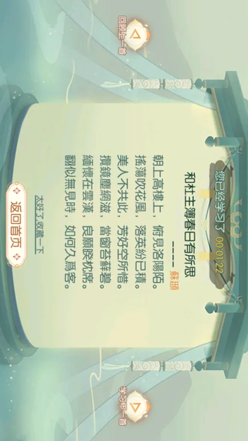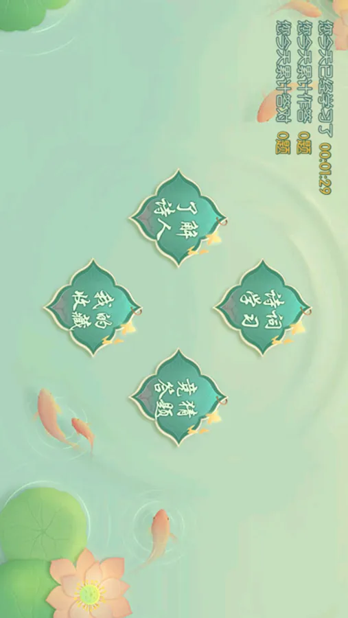 海量的诗词、诗人内容供您学习,有学习时长记录,看到喜欢的诗词可以收藏,学习之余还可以刷刷题