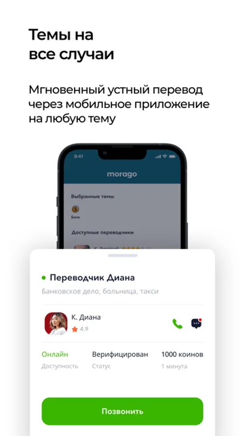 Свободно общайтесь с помощью переводчика Мораго. Проблема в банке, неразбериха в такси, или просто повседневная ситуация? Наши переводчики помогут разобраться. Вы можете воспользоваться нашим приложением даже в самых сложных ситуациях. Наши переводчики имеют соответствующие сертификат. Вы звоните настоящему переводчику, который поможет понять, что говорят на корейском языке. Воспользоваться приложением так же просто, как позвонить по телефону. Мораго переведёт на понятный.