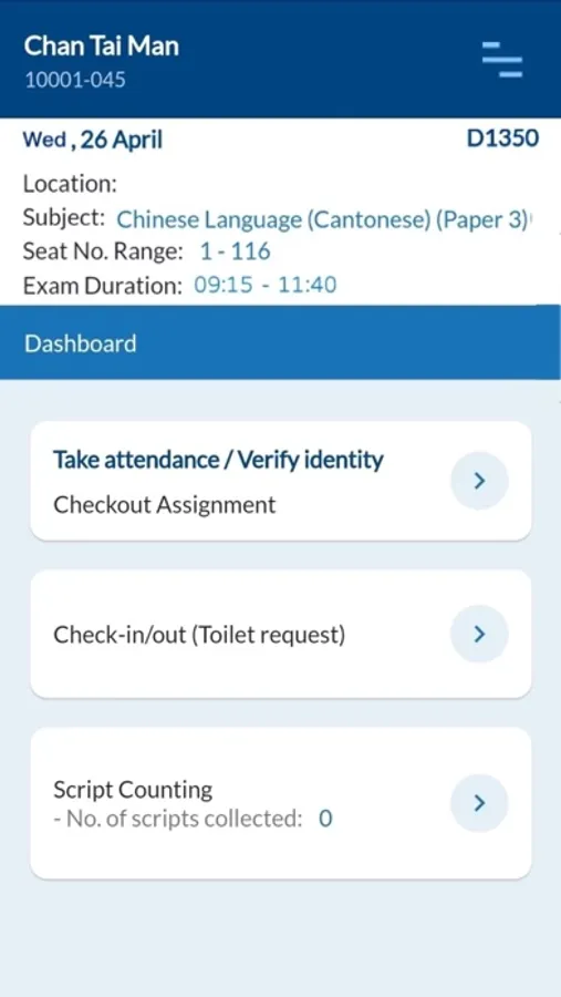 i-Invigilation is one of the mobile applications under HKEAA's 2nd Generation Public Examinations Support System (PESS2)designated for invigilators. It aims to facilitate invigilators to perform invigilation duties in the examination centres of HKDSE.Content and functions include: