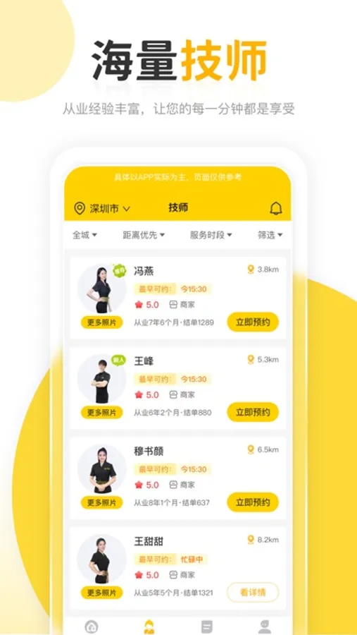 2、附近技师:根据地图和定位,快速找到距离近、上门快的技师,有地图模式展示和列表模式展示