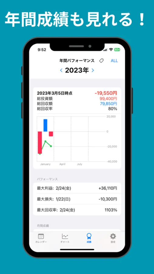 チャート:収支の推移を直感的に把握。期間ごとの成果や損失の傾向を視覚的に捉えることが可能です。