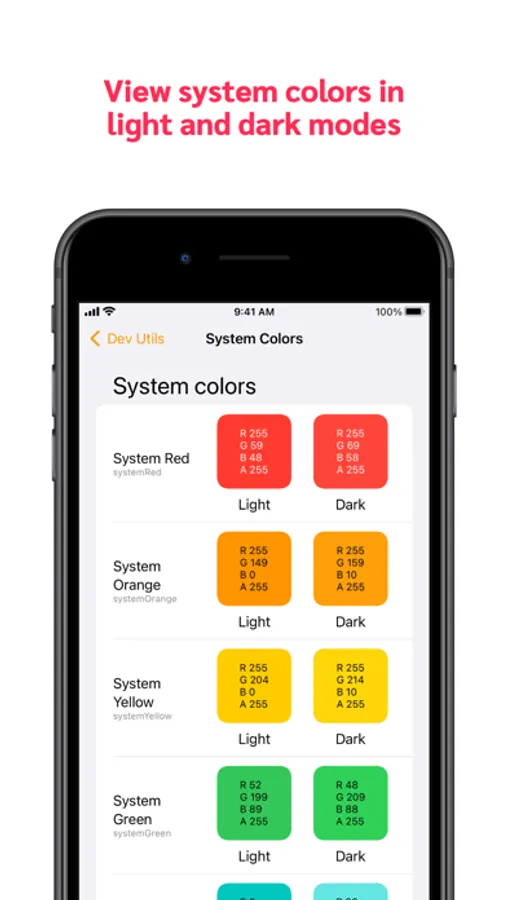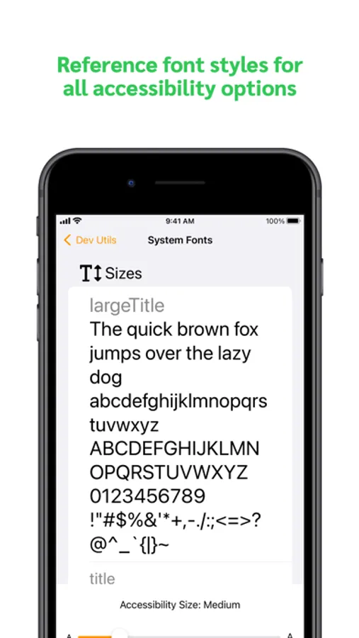 - Compare system fonts and colors with adjustable sizing and dark mode support.