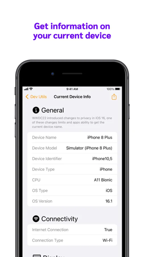 - Quickly view your device's type, storage, connectivity, cameras, and more. Easily share device info with others.