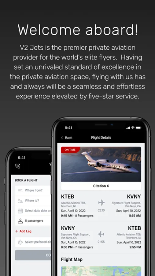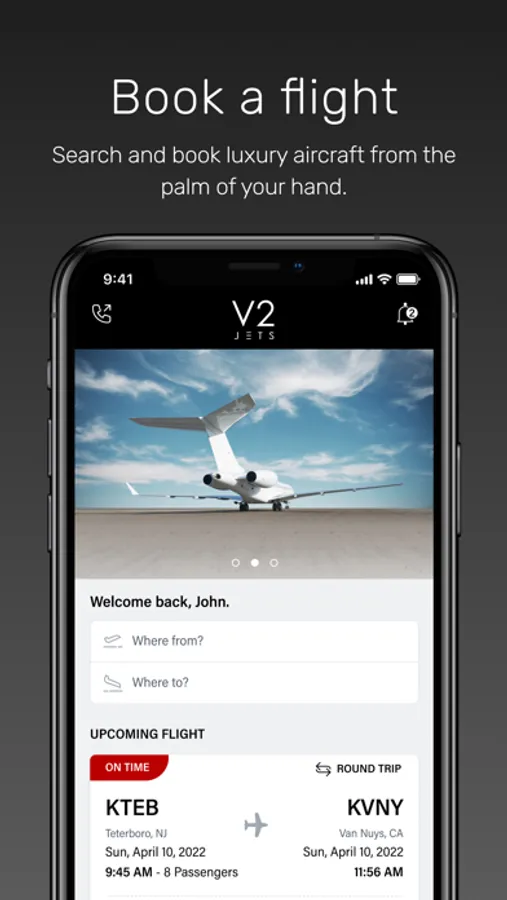 Early on in your V2 Jets app experience, you are matched with one of our expert Private Aviation Specialists who will guide you through the booking process and monitor every aspect of your flight from takeoff to touchdown. Our mission? Provide each client with the safest, most luxurious, and most customized experience possible on every single flight.