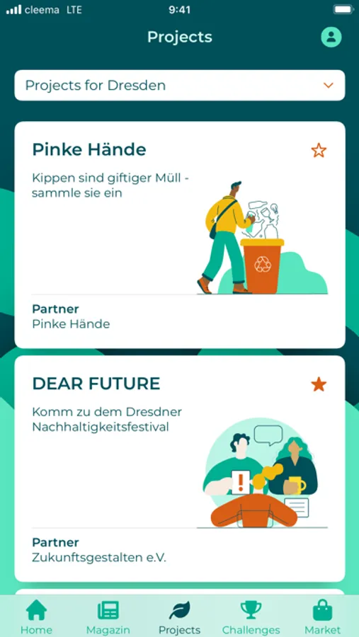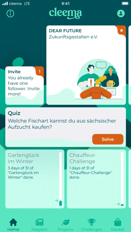 cleema makes your progress visible in the app as well as in the region. The dashboard gives you an overview of your activities: Which projects do you favor? What news do you have? Which challenges are coming up? In the sustainability quiz, you can ask yourself exciting questions about sustainability and climate protection. There you can find out how environmentally aware you already are and test your knowledge.