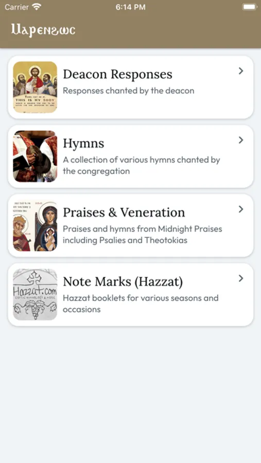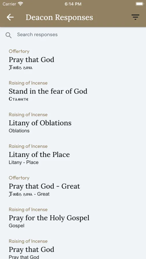 Each menu displays the appropriate text related to that section and can be filtered based on certain criteria such as season, service, feasts or fasts, as well as tune. Where applicable, there will also be displayed an information section which will display information on when the specified response or hymn is chanted.