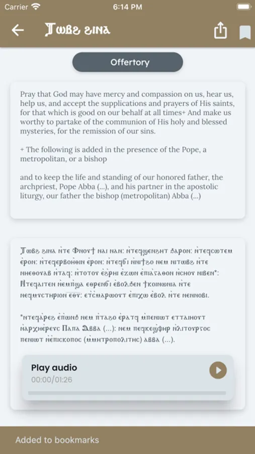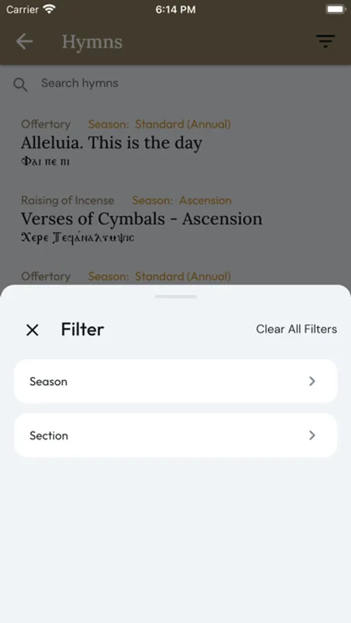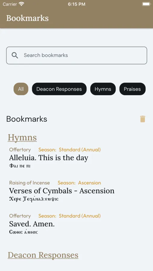 You may choose to bookmark a certain hymn or response. You can then search through these bookmarked items using various filters.