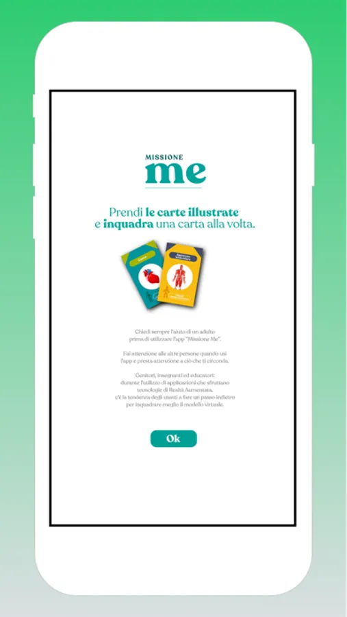 Missione Me è un'app che permette di visualizzare organi, sistemi e apparati del corpo umano in realtà aumentata, semplicemente inquadrando le carte gioco Missione Me.