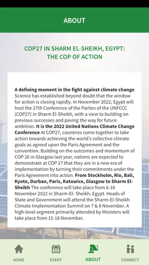 At COP 27, countries come together to take action towards achieving the world's collective climate goals as agreed under the Paris Agreement and the Convention. Building on the outcomes and momentum of COP 26 in Glasgow last year, nations are expected to demonstrate at COP 27 that they are in a new era of implementation by turning their commitments under the Paris Agreement into action. The conference will take place from 6-18 November 2022 in Sharm el-Sheikh, Egypt. Heads of State and Government will attend the Sharm el-Sheikh Climate Implementation Summit on 7 and 8 November. A high-level segment primarily attended by Ministers will take place from 15-18 November.