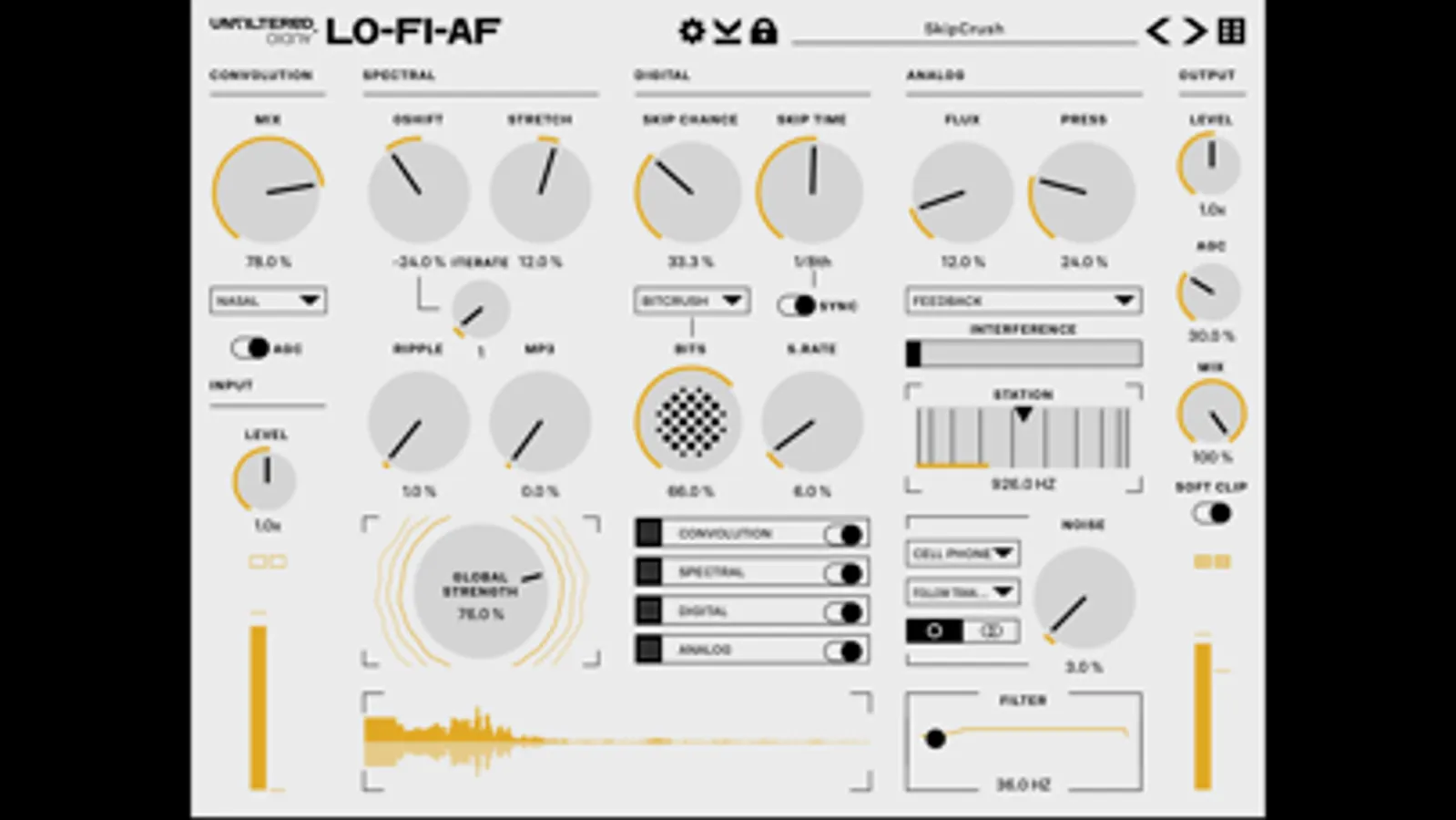 lo-fi-af takes your sound on a journey of artifacts and noise throughout recorded history, from tape warbles and vinyl noise to MP3 chirps and cell phone speaker chatter. lo-fi-af's many sections and versatile algorithms can place your sound in a different decade, or give it a thoroughly modern spin through compound processing.
