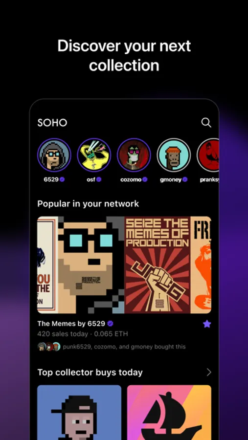 Introducing Soho, a mobile platform for NFT collectors and creators. Soho helps you see what's happening with NFTs:
