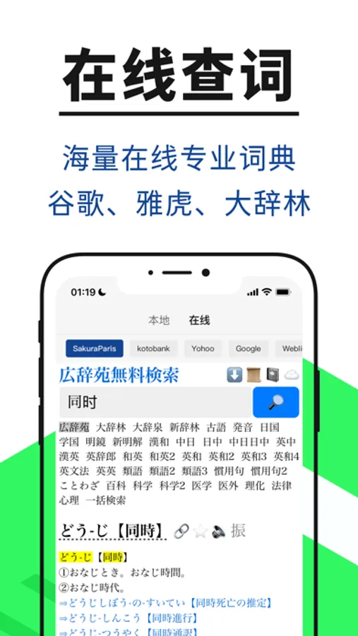 1、本地10万词汇+20在线辞典查词,让查词更精确全面